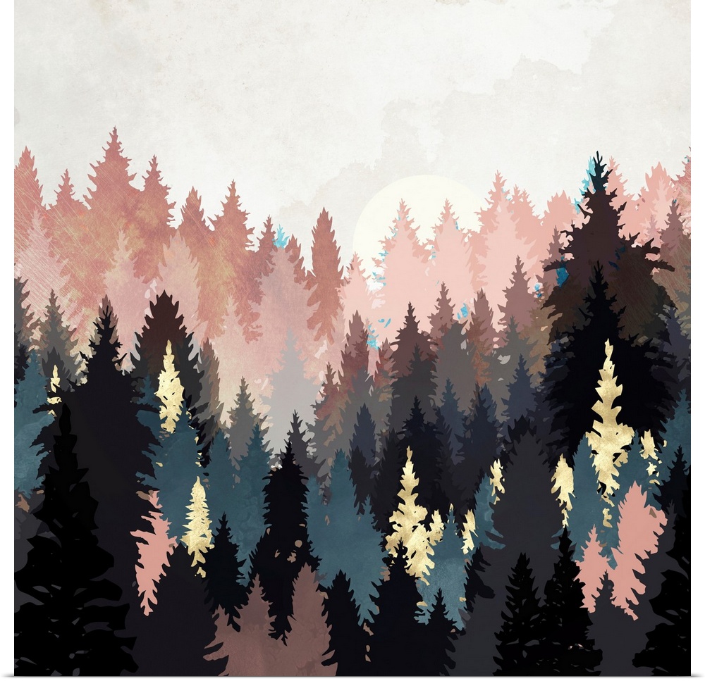 <p>Abstract depiction of a spring forest with grey, pink, teal, gold and texture.</p>