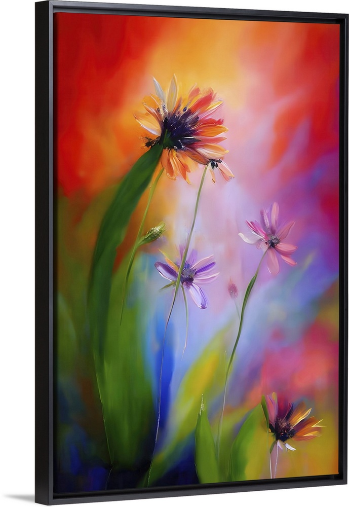 <p>Vibrant colors blend seamlessly to create a dreamy background for delicate flowers, with petals in shades of pink and orange. Tall green stems and leaves provide contrast against the vivid reds and purples surrounding them.</p>