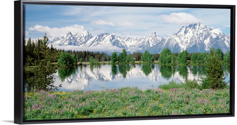 <p>Large photo on canvas of a rugged mountain range with a lake in the foreground and a tree line seperating the two.</p>