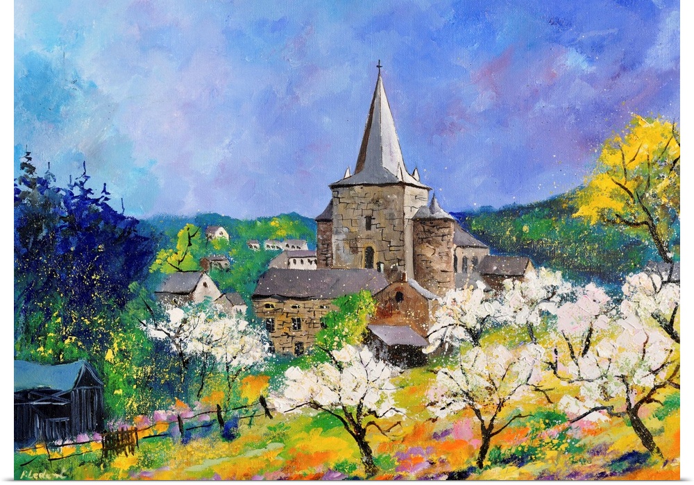 <p>Horizontal painting of a spring landscape with white blooming trees in the foreground and a village in the background.</p>