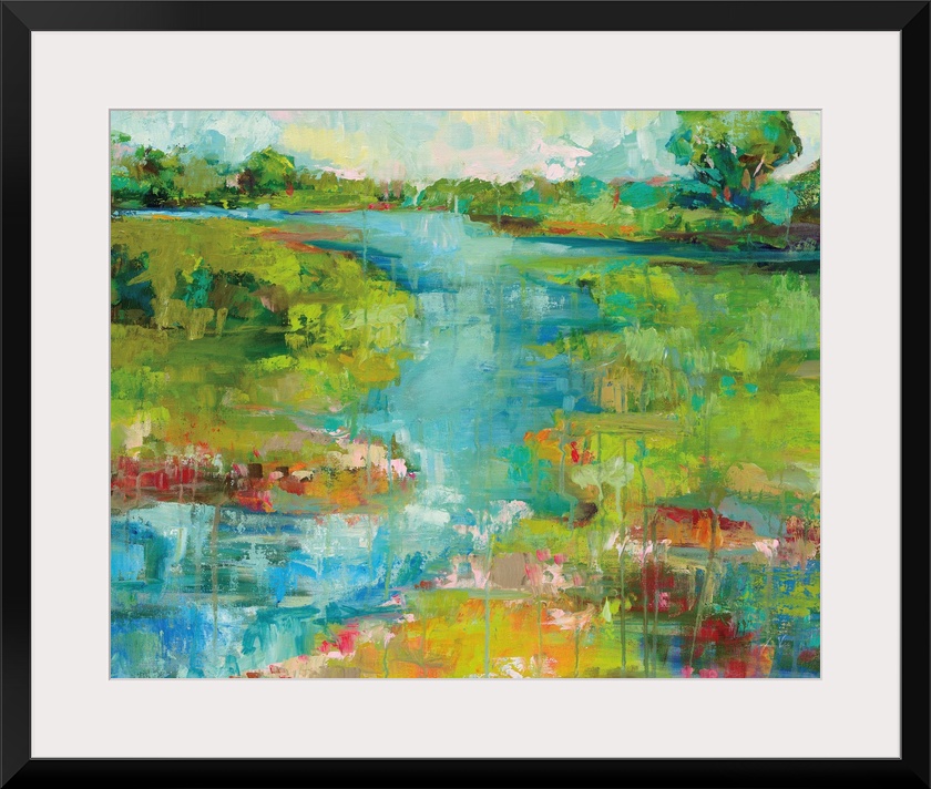 <p>Contemporary painting of a river running through a landscape.</p>