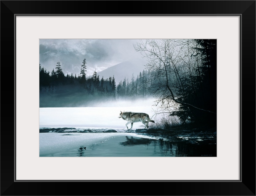 <p>A wolf makes its way along a thawing lake.</p>