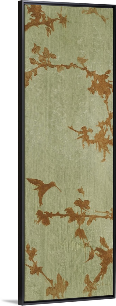 <p>A long vertical painting of bronze colored leaves on a muted green background.</p>