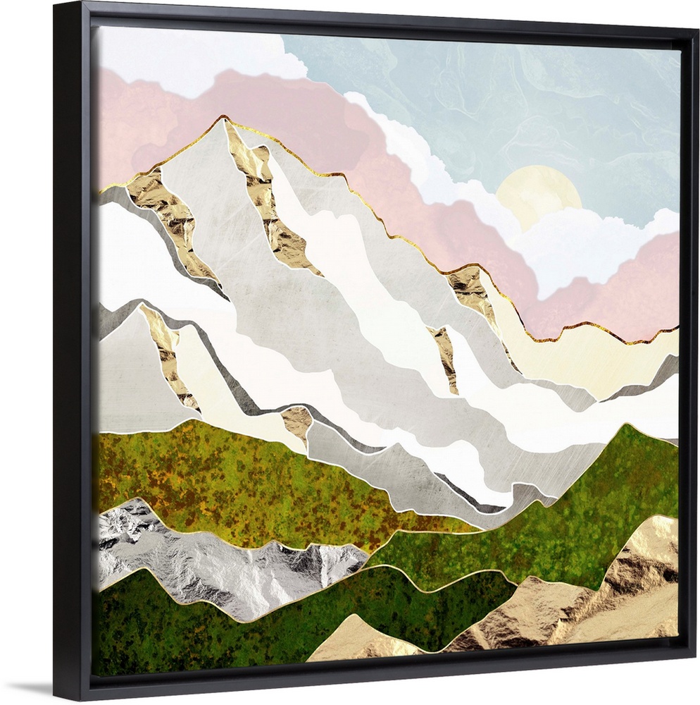 <p>Abstract depiction of a mountain in spring with gold, pink, white and green.</p>
