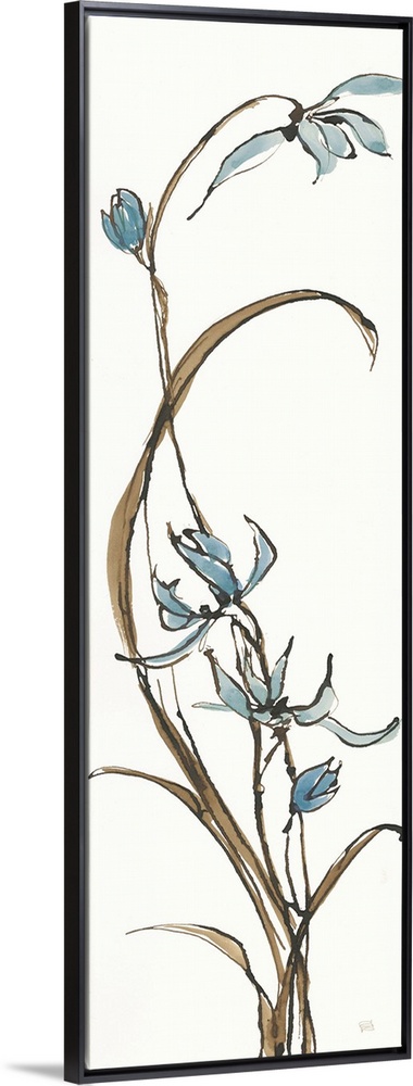 <p>Tall, rectangular watercolor painting of orchids in tan and blue on a solid white background.</p>