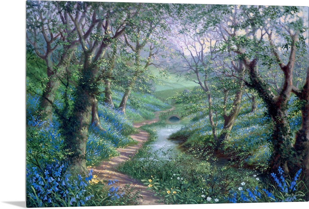 <p>Contemporary painting of winding path through lush forest.</p>
