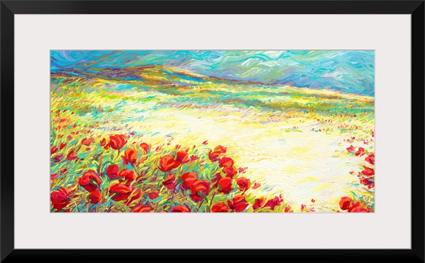 <p>Brightly colored contemporary artwork of a landscape of red flowers.</p>