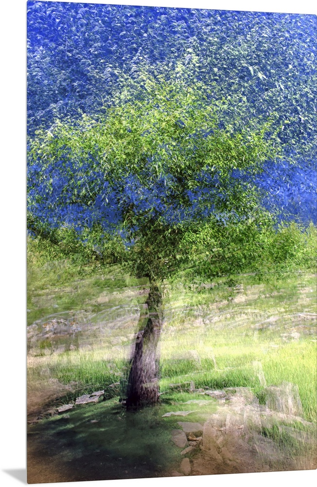 <p>Dream-like photograph of a tree with bright green leaves scattered into the air and movement on the ground created by a long, moving exposure.</p>
