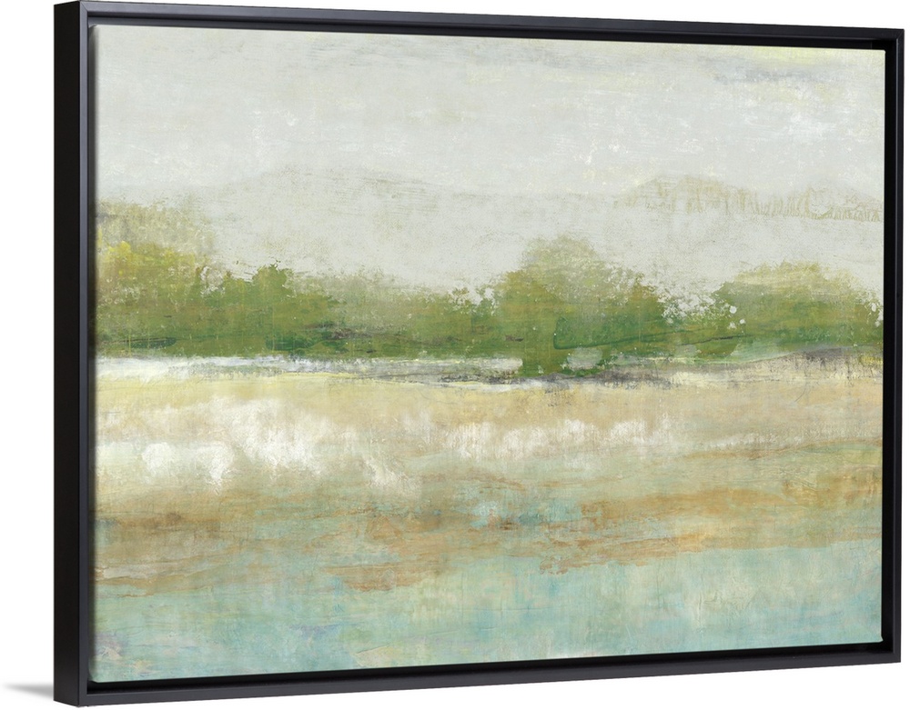 <p>Contemporary landscape painting of a meadow with green trees along the edge.</p>