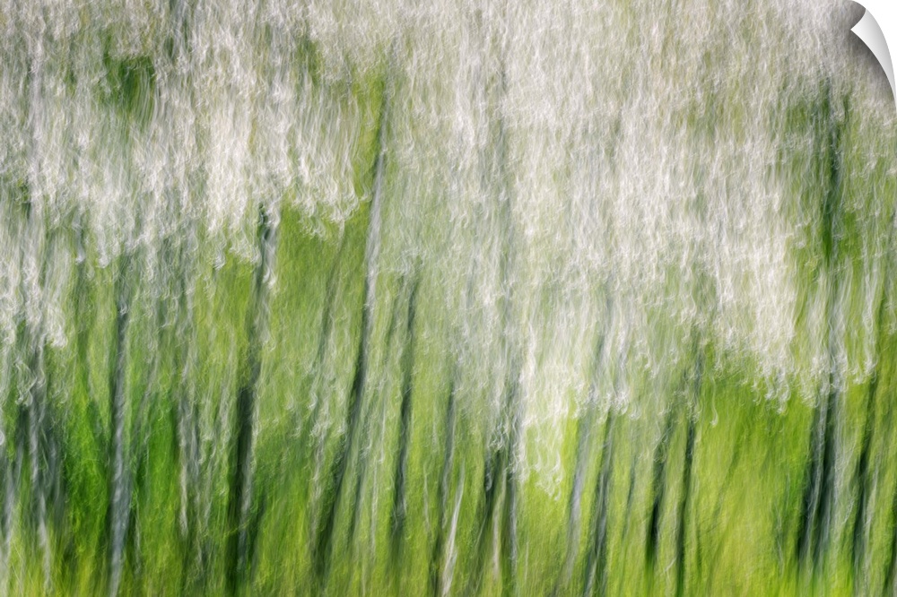 <p>Blurred motion image of a a row of blossoming trees, creating an abstract image.</p>