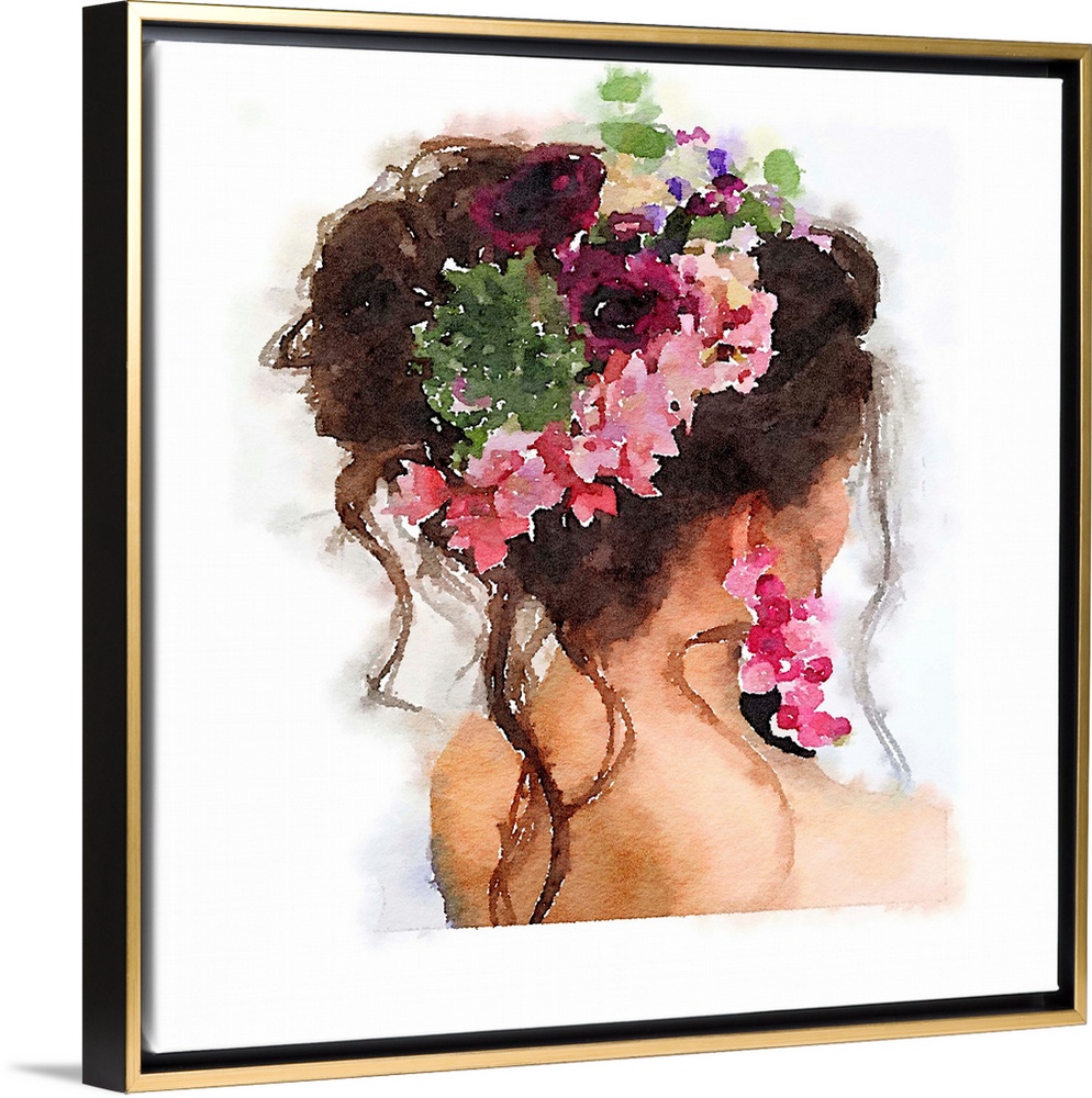 <p>Watercolor portrait of a woman with her hair styled up and decorated with flowers.</p>
