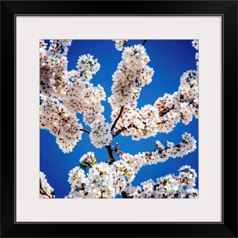 <p>Square photograph of white blossoms on a plum tree with the blue sky in the background.</p>