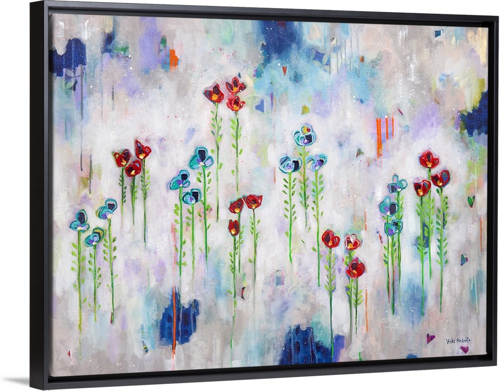 <p>Vibrant abstract painting with blue and red flowers that appear to be floating in sets of three with long green stems and leaves on a colorful background.</p>