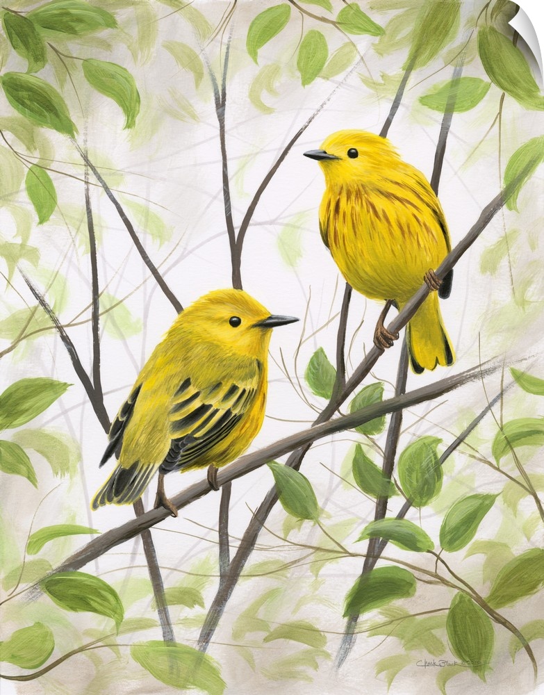 <p>Contemporary painting of two Warblers perched on branches and surrounded by green leaves.</p>