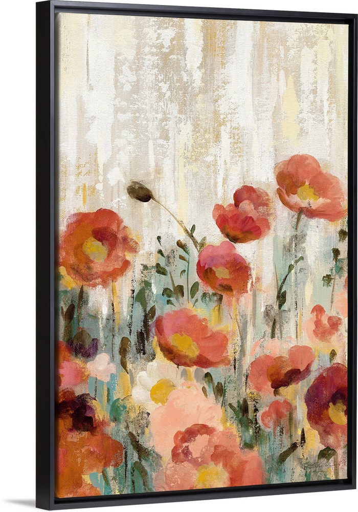 <p>Painting of multi-colored blooming flowers in a garden with streaks of neutral tones in the background.</p>
