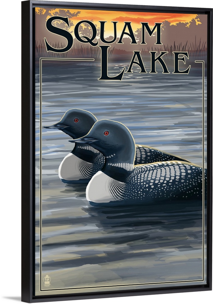 <p>Retro stylized art poster of a pair of loons in a lake at sunset.</p>