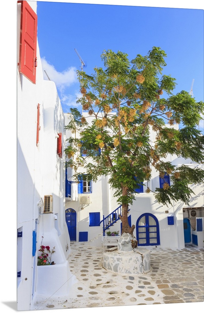 <p>Square with blossoming tree, whitewashed buildings, blue sky, Mykonos Town, Mykonos, Cyclades, Greek Islands, Greece</p>