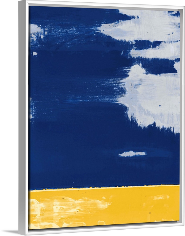 <p>Contemporary asymmetrical abstract painting with a sectioned yellow bottom and a blue top with grey brushstrokes throughout.</p>