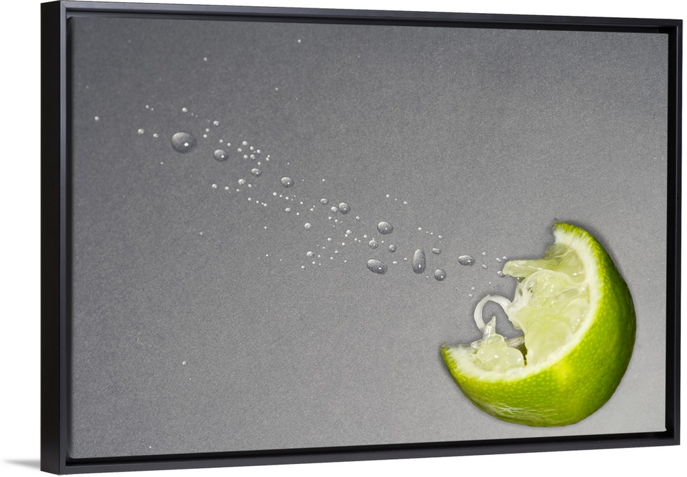 <p>Large canvas photo art of a lime slice with juice coming out on a neutral background.</p>