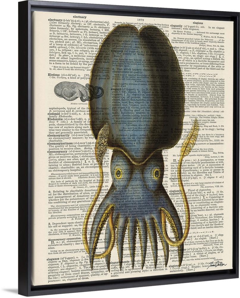 <p>Contemporary artistic use of a page from a dictionary with a scientific illustration of a squid on top of the text.</p>