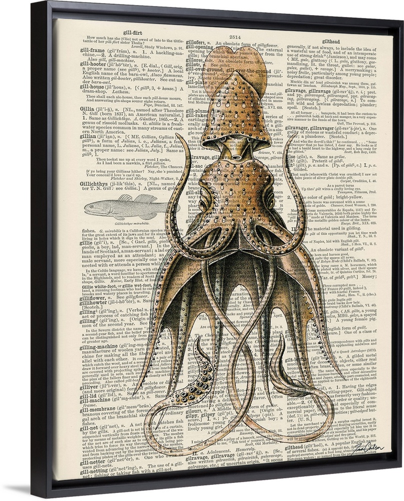<p>Contemporary artistic use of a page from a dictionary with a scientific illustration of a squid on top of the text.</p>