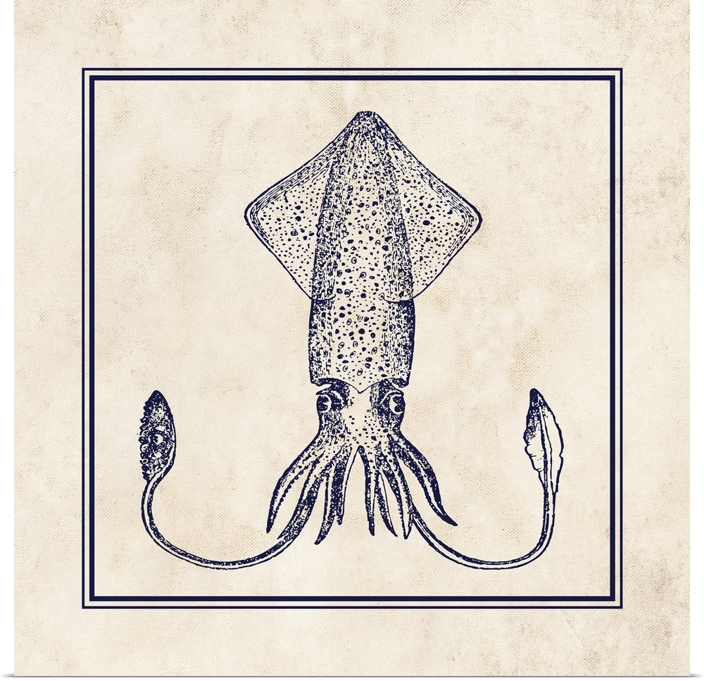 <p>Square illustration of a detailed squid in navy blue and cream.</p>