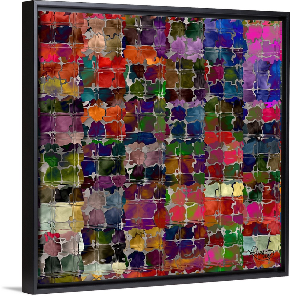 <p>Square abstract art with silver squiggly lines making small squares with different colors blended together inside.</p>
