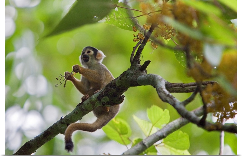 <p>Peru. A Squirrel monkey feeds on flowers in the lush, tropical forest on the banks of the Madre de Dios River.</p>