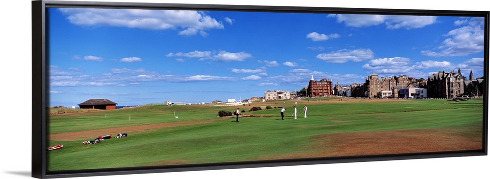 <p>A group of people tee off on a golf course in the UK. Buildings on the course line the right side of the panoramic piece.</p>