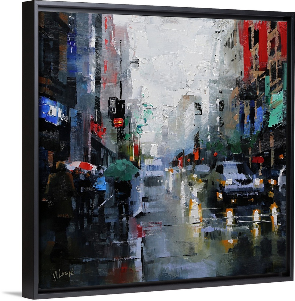 <p>Contemporary painting of traffic in the streets on a rainy day in Montreal.</p>