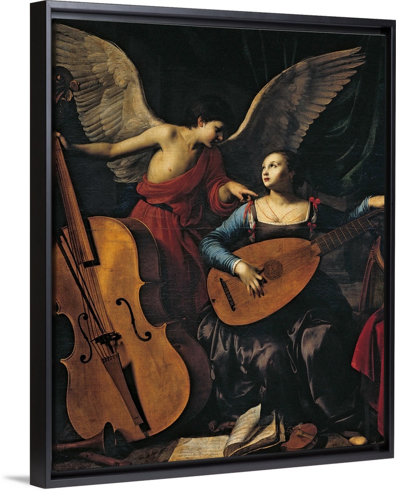 <p>St Cecilia and the Angel, by Carlo Saraceni, 1606 about, 17th Century, oil on canvas, cm 172 x 139 - Italy, Lazio, Rome, National Gallery of Ancient Art, Palazzo Barberini. All. Angel young woman St Cecilia musical instruments bass lute harp violin score</p>