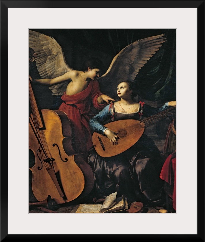 <p>St Cecilia and the Angel, by Carlo Saraceni, 1606 about, 17th Century, oil on canvas, cm 172 x 139 - Italy, Lazio, Rome, National Gallery of Ancient Art, Palazzo Barberini. All. Angel young woman St Cecilia musical instruments bass lute harp violin score</p>
