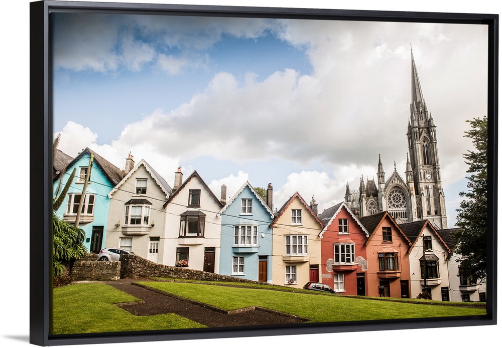 <p>Colorful facades from a row of houses in the Old Town, with St. Colman's cathedral in the background, Cobh, County Cork, Ireland, Europe</p>