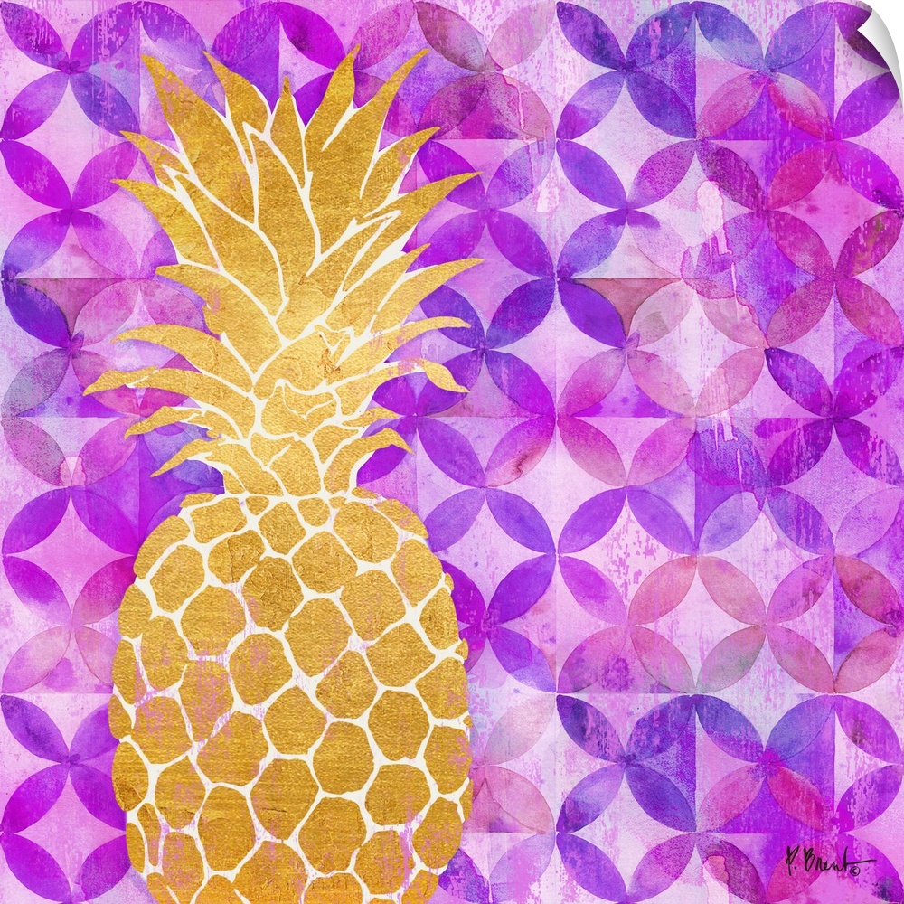 <p>Square decor with a metallic gold pineapple on a purple and pink patterned background.</p>