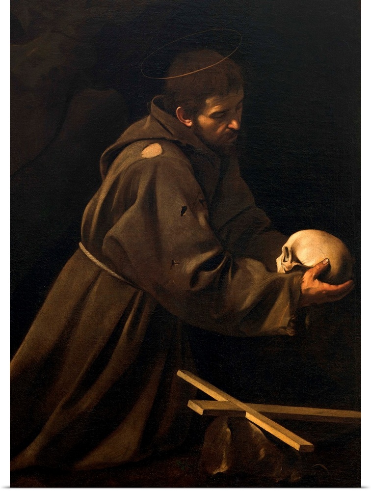 <p>St Francis in Meditation, by Michelangelo Merisi known as Caravaggio, 1606 - 1614, 17th Century, oil on canvas, cm 128,2 x 97,4 - Italy, Lazio, Rome, Santa Maria della Concezione Church. All. St Francis friar aureole halo beard habit belt rope skull, Vani</p>