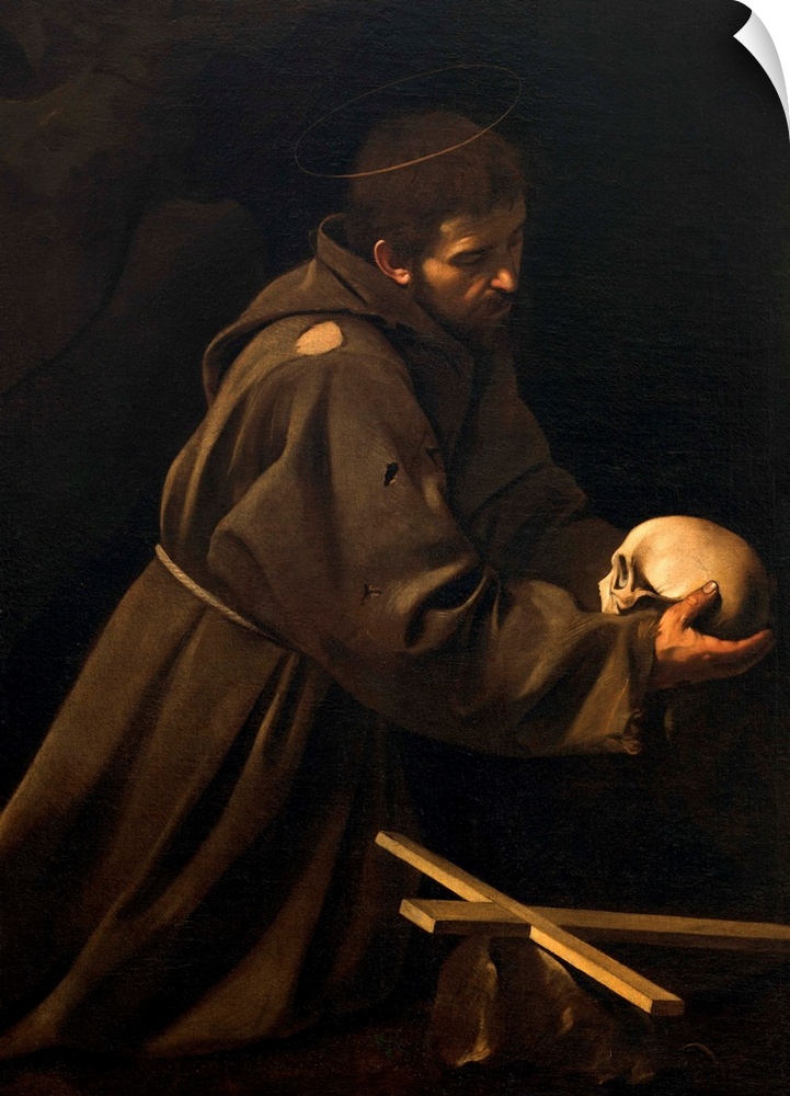 <p>St Francis in Meditation, by Michelangelo Merisi known as Caravaggio, 1606 - 1614, 17th Century, oil on canvas, cm 128,2 x 97,4 - Italy, Lazio, Rome, Santa Maria della Concezione Church. All. St Francis friar aureole halo beard habit belt rope skull, Vani</p>