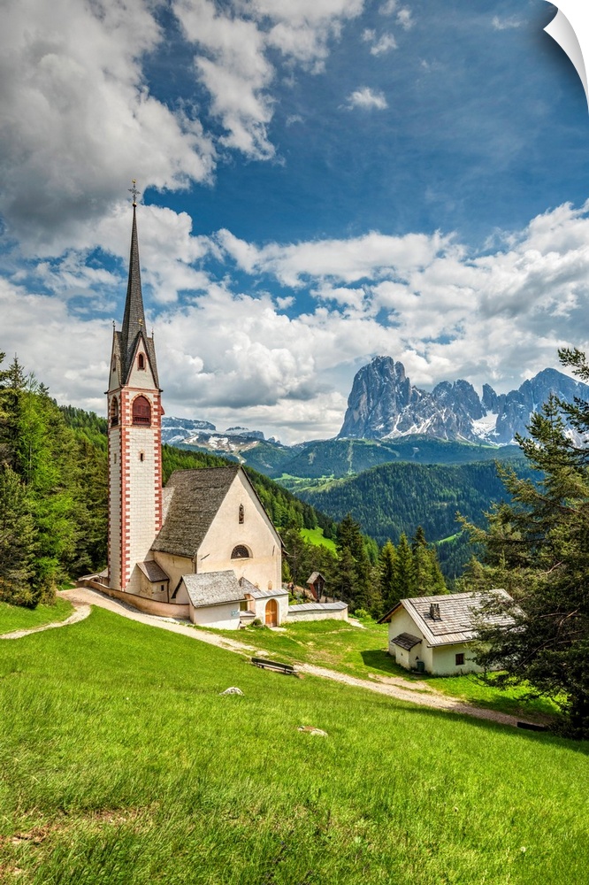 <p>St. Jakob Church With Langkofel - Sassolungo Mountain Group In The Background, Ortisei - St. Ulrich, Trentino Alto Adige - South Tyrol, Italy</p>