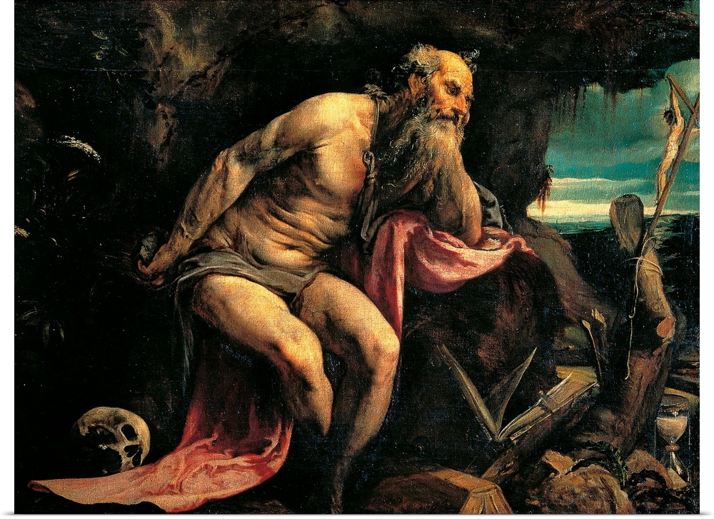 <p>St Jerome, by Jacopo Da Ponte known as Bassano, 1560 about, 16th Century, oil on canvas, cm 119 x 154 - Italy, Veneto, Venice, Accademia Art Galleries. All. St Jerome beard skull Vanitas crucifix stone cave books hermit light landscape pink black brown wh</p>