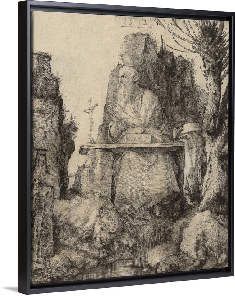 <p>St Jerome in the Wilderness, by Albrecht Durer, 1512, German print, copper dry point engraving. Jerome as a hermit in the desert, praying from a rocky desk. At his feet is a lion, his symbol.</p>
