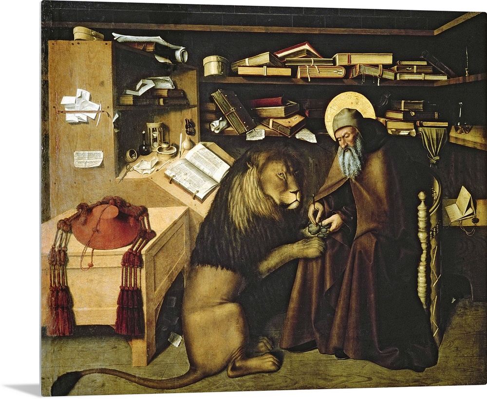 <p>Saint Jerome tirant une epine de la patte du lion; removed thorn and lion remained loyal to him;</p>