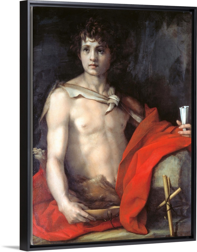 <p>St John the Baptist, by Andrea DAgnolo known as Andrea del Sarto, 1522 about, 16th Century, tempera on panel, cm 94 x 68 - Italy, Tuscany, Florence, Palazzo Pitti, Palatine Gallery. All. Young man saint St John The Baptist hide skin bowl scroll cross. (17</p>