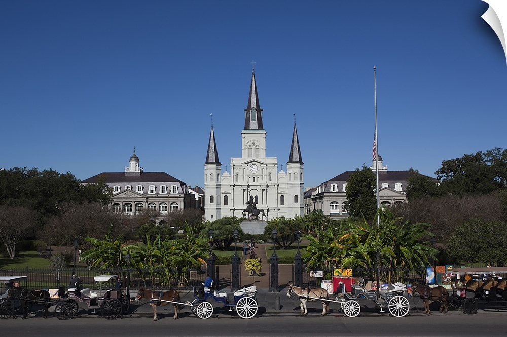 <p>Several mule-drawn carriages in front of the St. Louis Cathedral in New Orleans, Louisiana.</p>