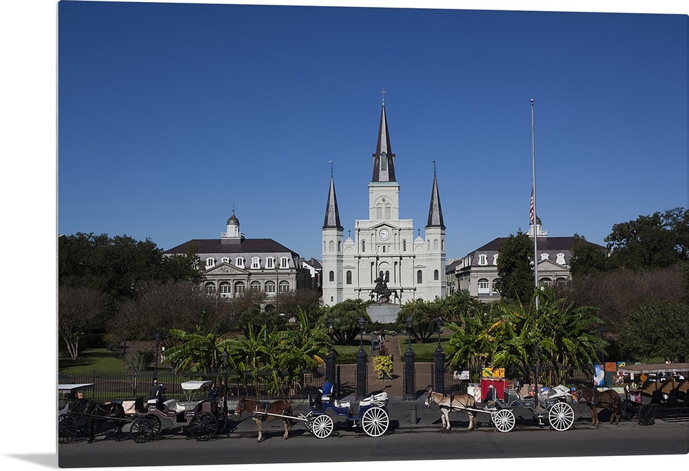 <p>Several mule-drawn carriages in front of the St. Louis Cathedral in New Orleans, Louisiana.</p>