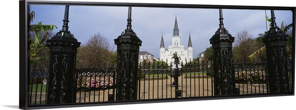 <p>Panoramic photo on canvas of a big house of worship that is seen through iron fences located in Louisiana.</p>