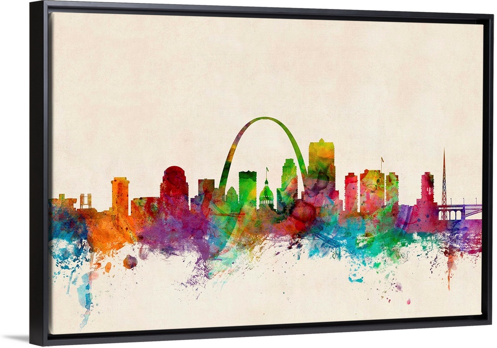 <p>Contemporary piece of artwork of the St Louis skyline made of colorful paint splashes.</p>