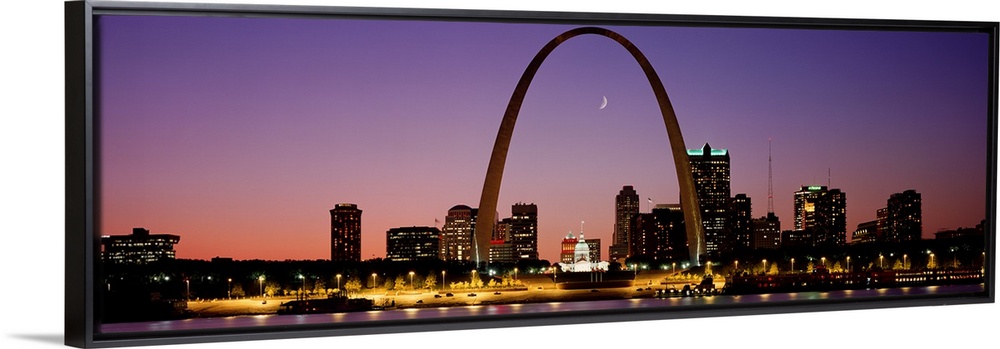 <p>Wide angle view of the St. Louis skyline including the Gateway Arch, at sunset.</p>