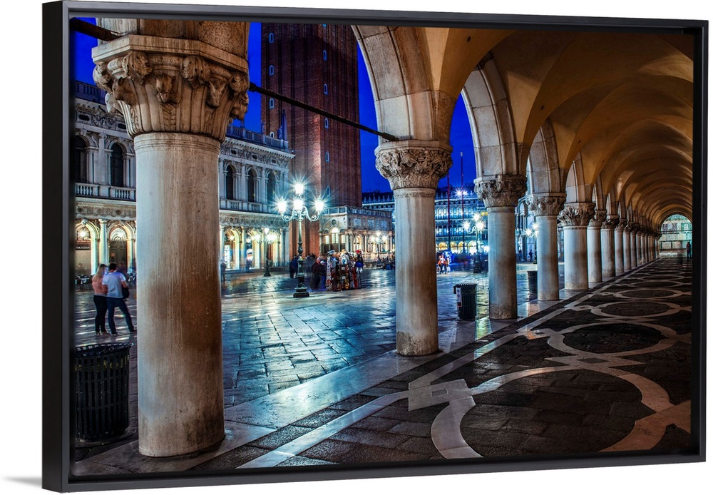 <p>Photograph of the view from underneath arches at night in St. Mark's Square, Venice.</p>