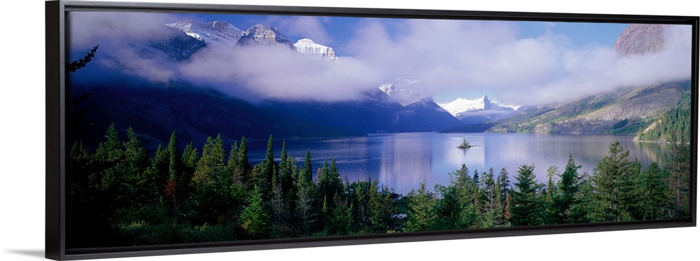 <p>Panoramic vista of a lake in the valley at the base of a mountain range in Montana, with a forest of pine trees at the edge.</p>