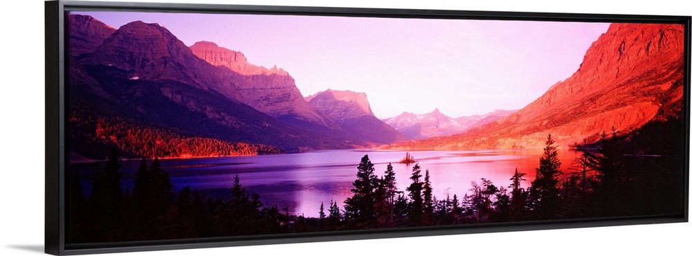<p>Mountains and trees surrounded a lake that reflects the colors of the setting sun on its surface in this landscape photograph that is panoramic shaped wall art.</p>