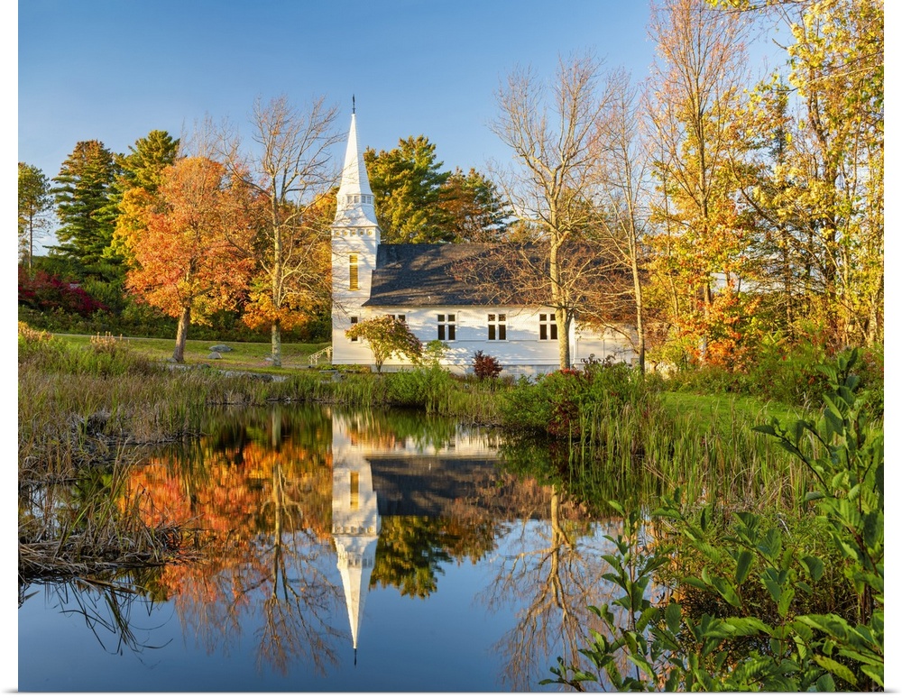 <p>St. Matthew's Chapel Reflecting in Pond, Sugar Hill, New Hampshire, New England, USA</p>
